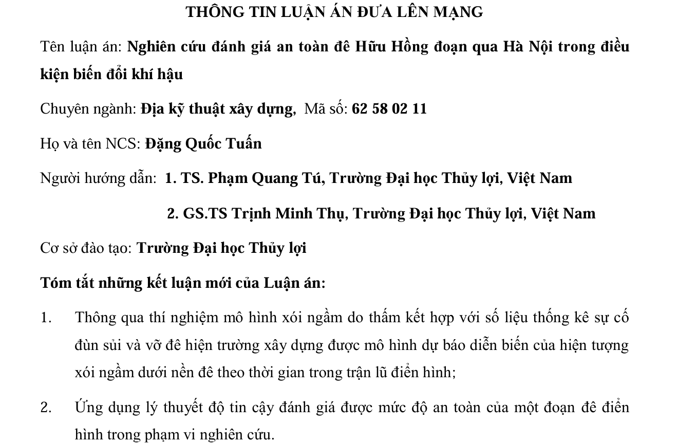 Luận án Nghiên cứu đánh giá an toàn đê Hữu Hồng đoạn qua Hà Nội trong điều kiện biến đổi khí hậu Lưu